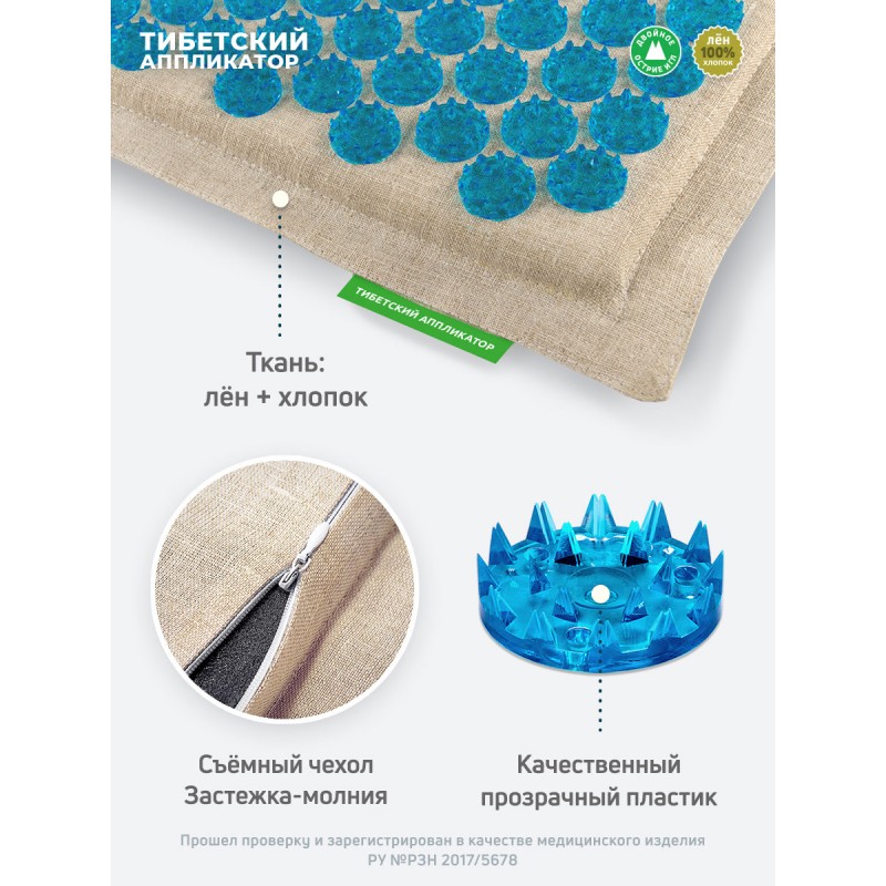 Мягкая основа толщиной 2 см обеспечивает комфорт при использовании, а полимерные иглы с двойным острием аккуратно и равномерно воздействуют на точки давления. Размер коврика 41×60 см позволяет охватывать значительные участки тела, а ярко-синий цвет и прочная ткань из льна и хлопка делают его долговечным и приятным на ощупь.