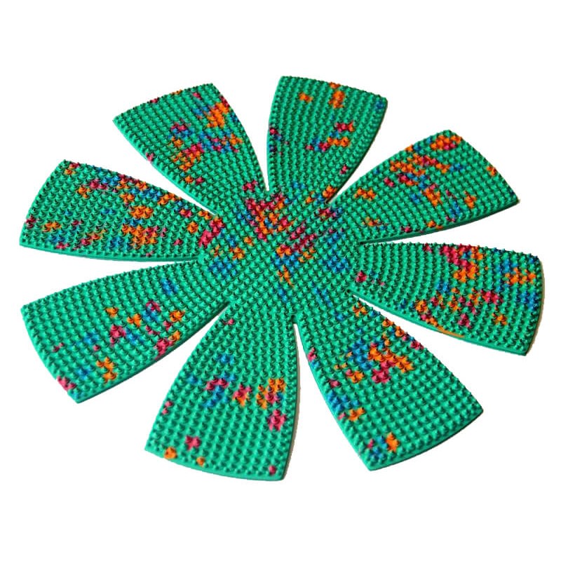 Коврик выполнен из эластичной резины с металлическими иглами из разных металлов, расположенных в шахматном порядке. Подвижные лепестки увеличивают площадь воздействия и позволяют коврику принимать форму тела, что особенно удобно при аппликации суставов, живота, поясницы и грудной клетки.