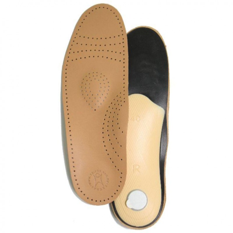 Стельки для закрытой обуви с прочным пластиковым каркасом, снабжены пяточным амортизатором и пелотом (выпуклостью) для переднего отдела стопы. Основа ‒ латексная пена с добавлением древесного угля, нейтрализующего запах и уменьшающего влажность в обуви, обладает противоскользящим эффектом, покрытие- натуральная кожа с противоскользящим эффектом.